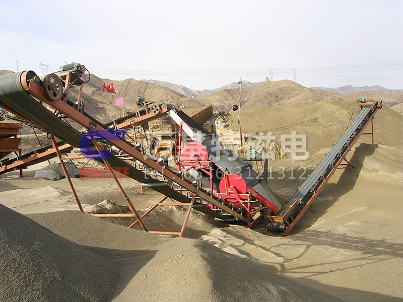 被皮帶輸送機(jī)輸送的散狀物料,通過安裝在尾部支架上的磁選機(jī)(即旋轉(zhuǎn)的直流磁鐵)時,物料中的鐵磁雜物被吸,由棄鐵膠帶將鐵磁雜物拽至電動滾筒卸下,...